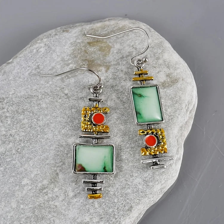 Unique bohemian-style earrings with a vintage geometric design, finished with elegant hooks for easy wear. A statement piece that combines artistry and timeless charm.