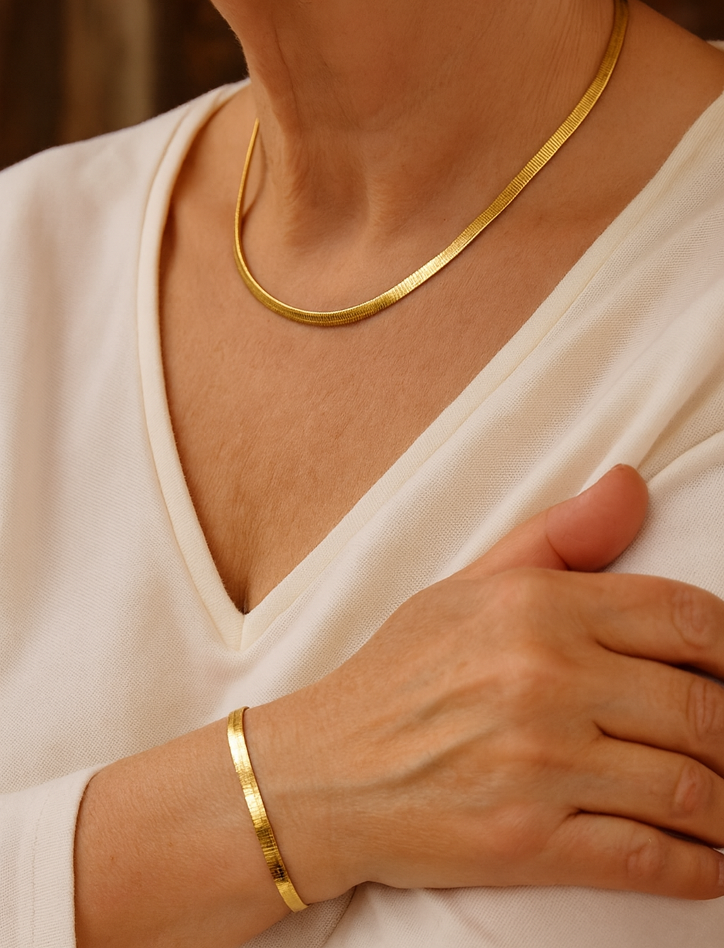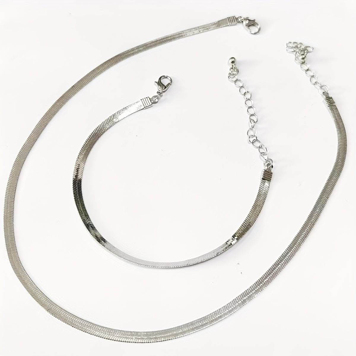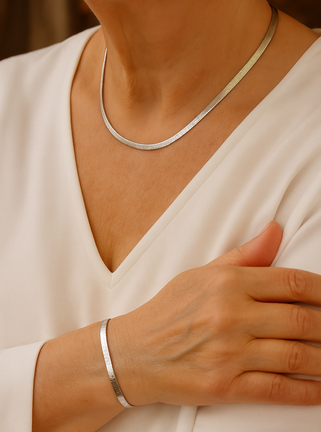 This herringbone necklace & bracelet offers a versatile combination, crafted from premium stainless steel and plated with 18K gold or .925 silver. Its sleek, minimalist design ensures durability and timeless elegance, making it suitable for both casual and formal wear. This bundle provides a refined accessory set that complements any style with subtle sophistication.