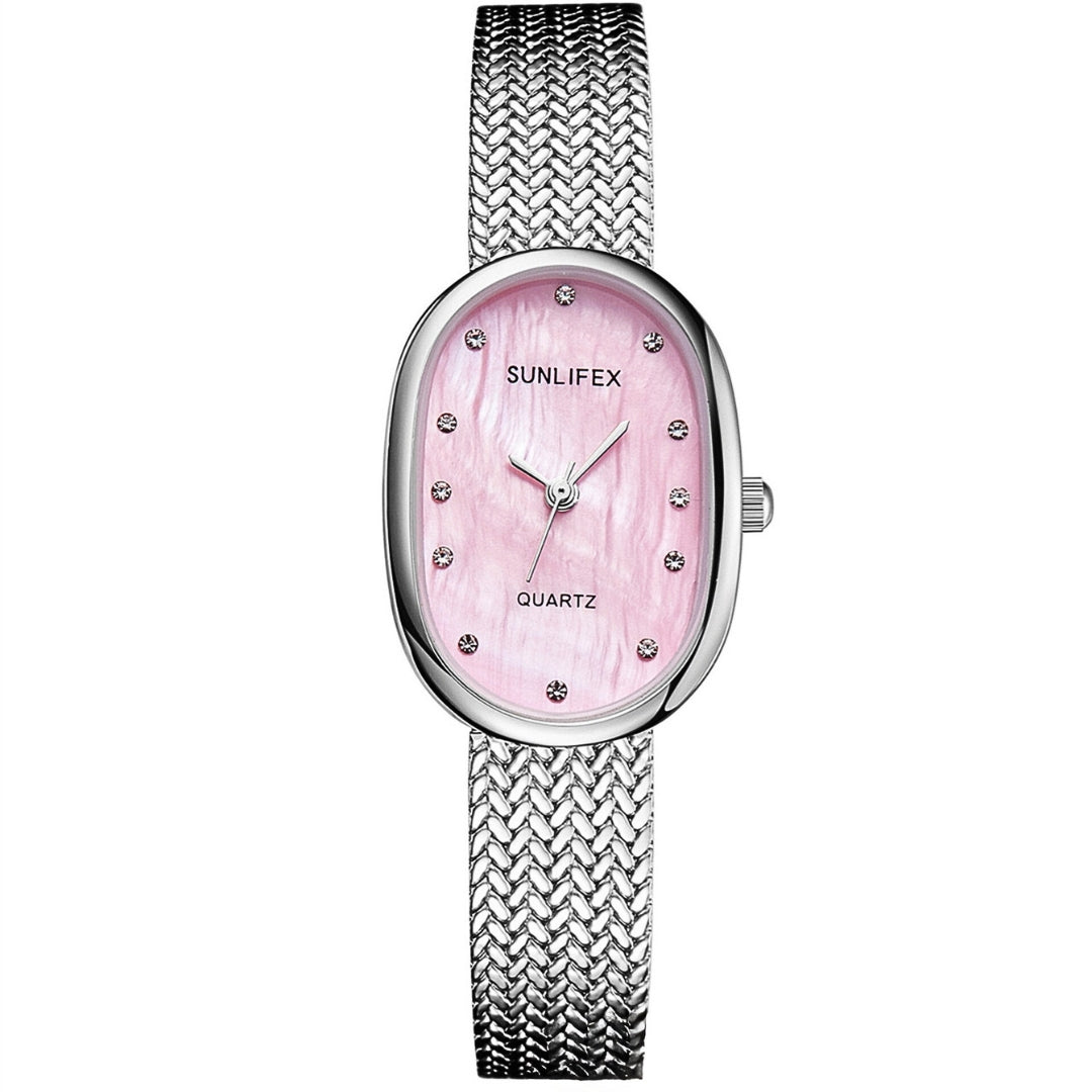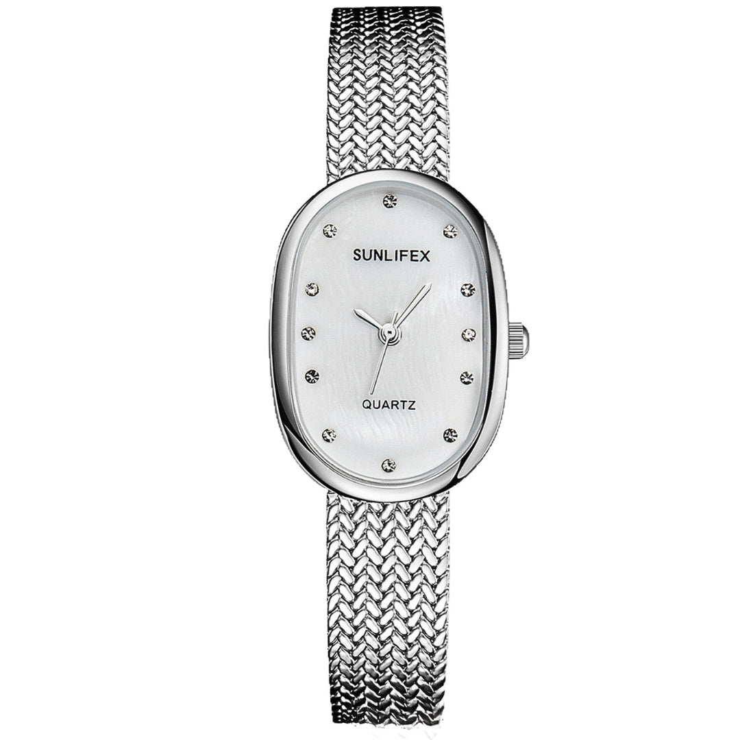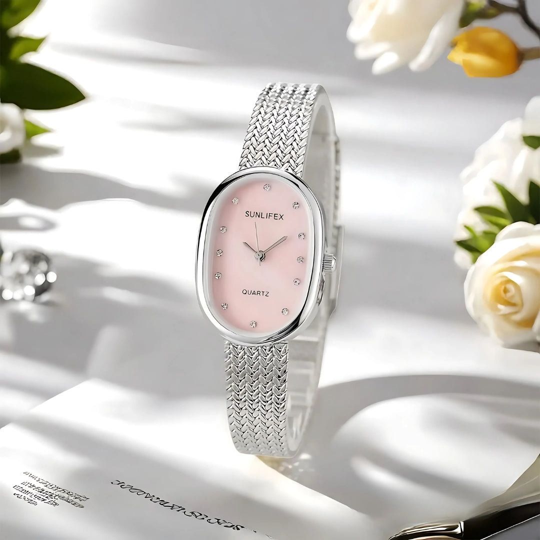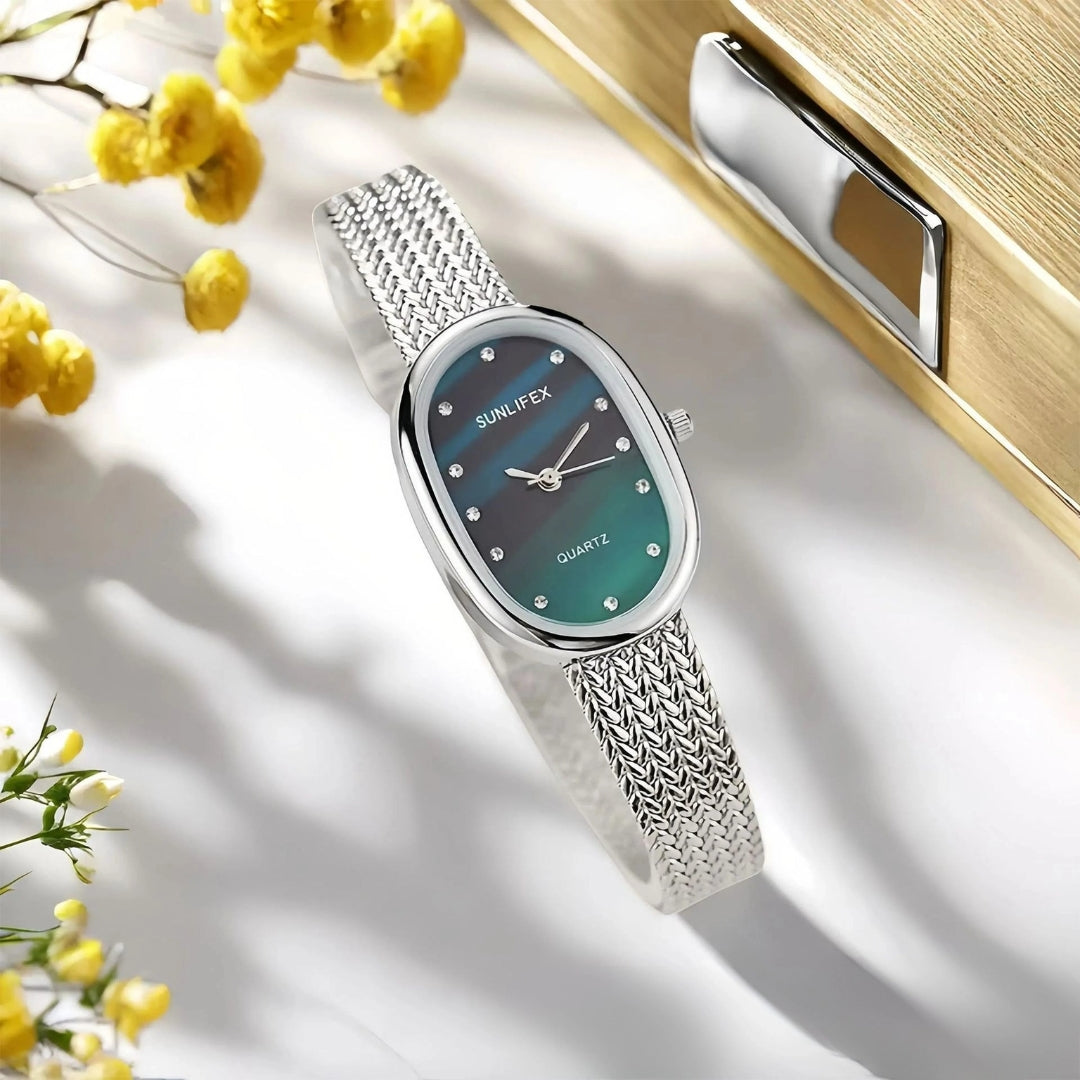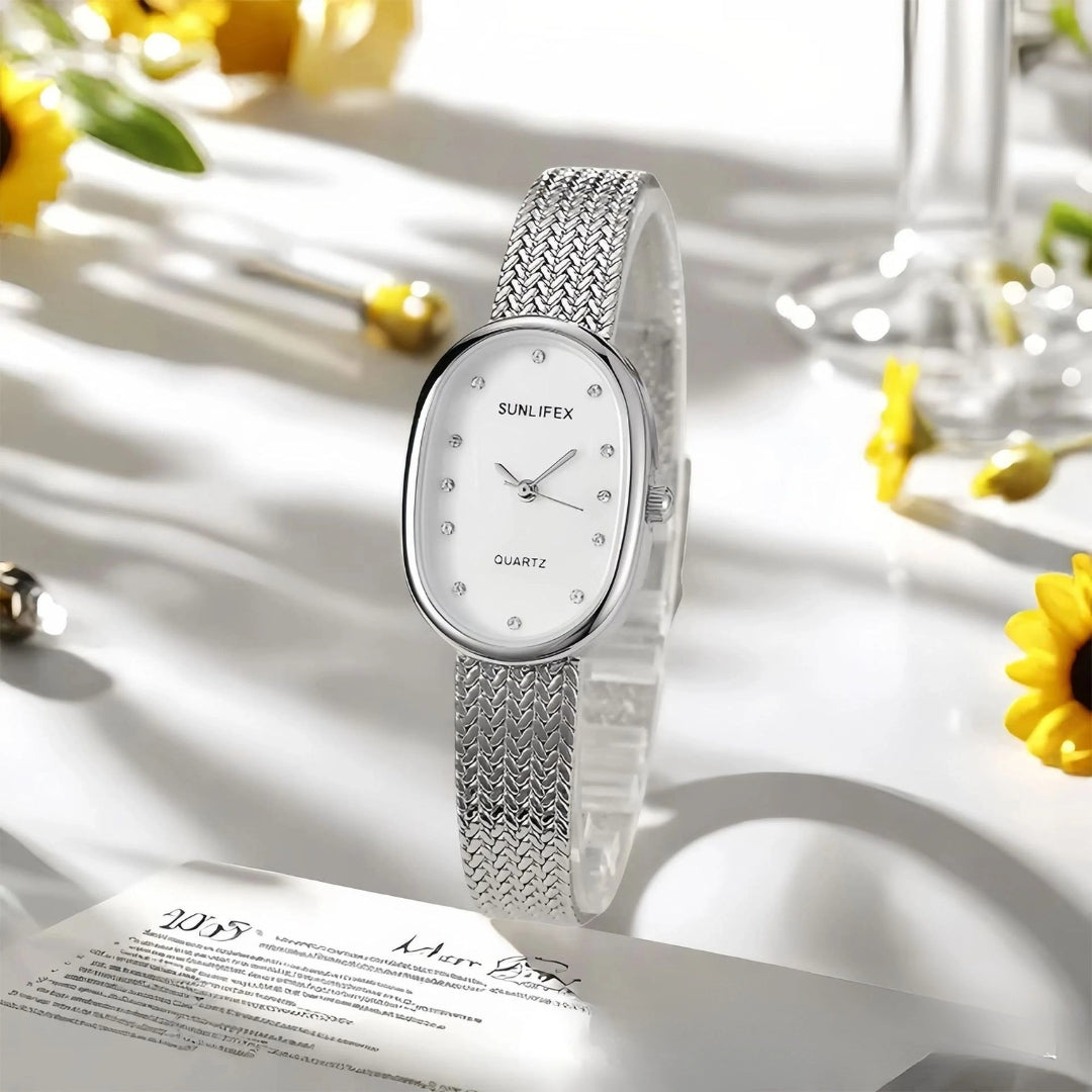 The Gilded Clair Watch shines with refined luminosity, echoing the radiance of a polished gem. It is designed for the woman who values grace above all, a subtle yet commanding statement of elegance.