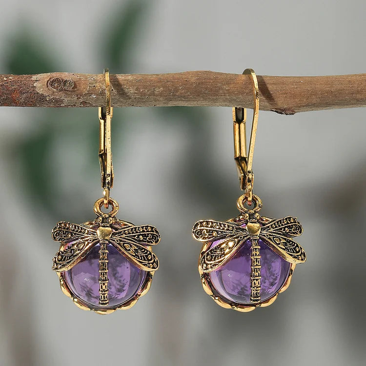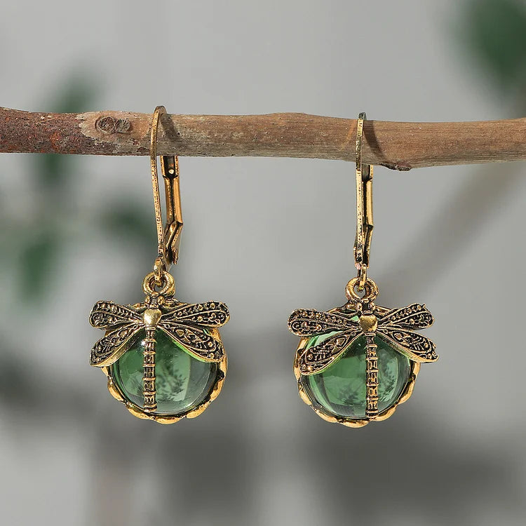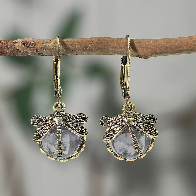 Unique earrings featuring delicate dragonfly motifs within a spherical antique silver design. A symbolic and timeless accessory to elevate your look.