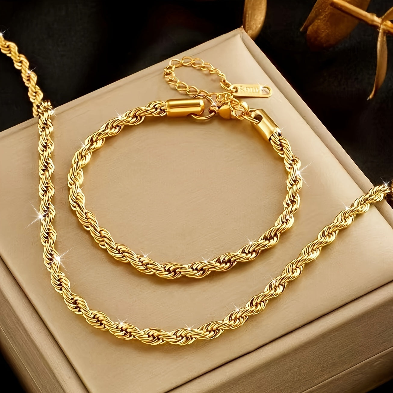Introducing our exquisite Gold-Plated Rope Chain Necklace & Bracelet Set—a true wardrobe essential for the modern woman who values both classic elegance and effortless style. This stunning set combines the timeless appeal of a twisted rope design with the durability you need for everyday wear.